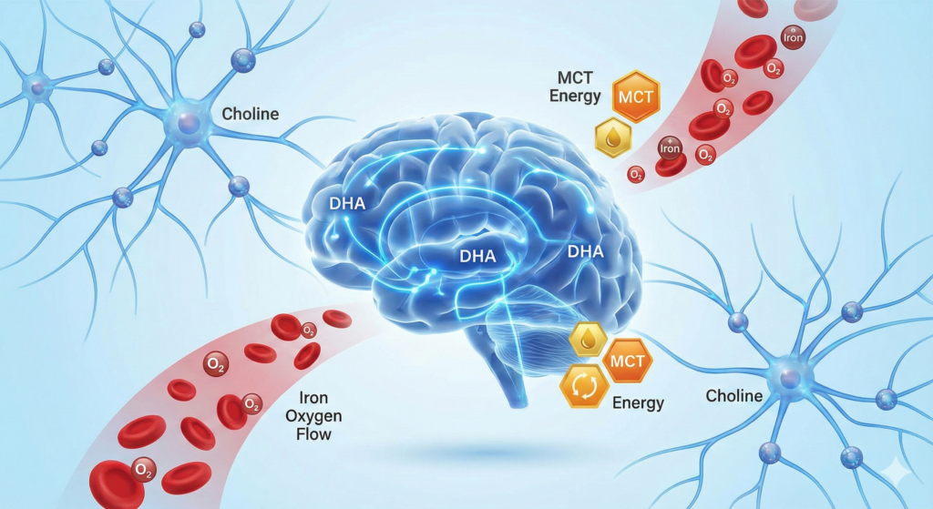 The developing brain requires specific nutrients for structure, energy, and function. DHA is a major structural component of the brain and retina. Choline supports neurotransmitter function and memory development. Iron aids oxygen delivery to the brain, supporting focus and cognitive performance. MCTs provide easily available energy for active brains.
