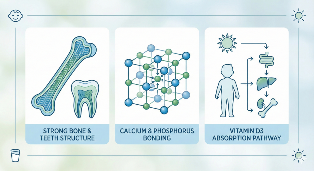 Bones and teeth require consistent mineral supply during childhood. Calcium and phosphorus work together to build bone density and strength. Vitamin D3 improves calcium absorption, while protein supports bone structure and maintenance during growth years.